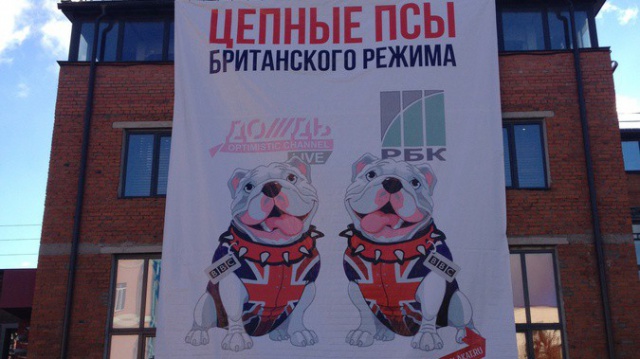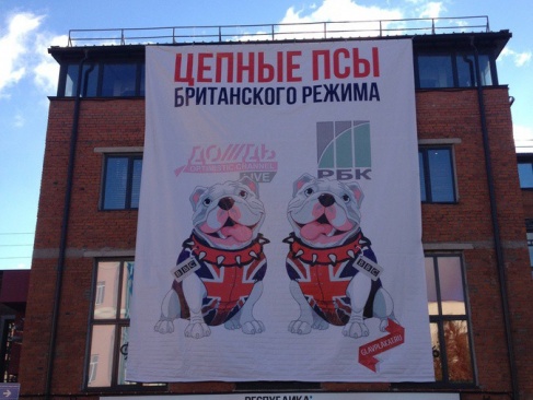 "В Москве, напротив редакции либерального телеканала "Дождь", вывешен баннер "РБК и "Дождь" — цепные псы британского режима". Благодарю москвичей за поддержку позиции партии "РОДИНА" по данному вопросу!" – написал на своей странице в Facebook лидер "РОДИНЫ", депутат Госдумы Алексей Журавлёв.