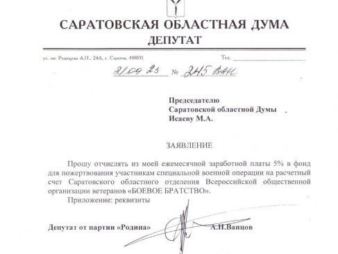 Депутат Саратовской областной Думы от партии "РОДИНА" Александр Ванцов выступил с инициативой о перечислении части своей заработной платы в фонд поддержки участников Специальной военной операции.