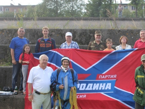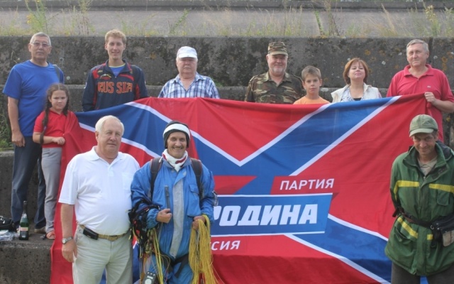 Легендарный альпинист, заслуженный мастер спорта Владимир Каратаев, в свой 61-й день рождения пролетел над Енисеем с пятиметровым флагом партии "РОДИНА".