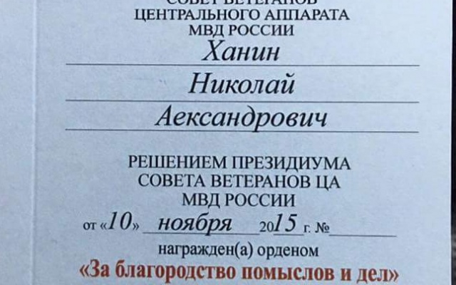 "За благородство помыслов и дел," - именно так звучит официальное название ордена Совета ветеранов Центрального аппарата МВД России. Напомним, что Ханин проделывает огромную работу по восстановлению школы в Горловке.