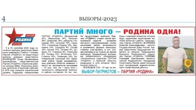 Агитационный материал о Предвыборной программе избирательного объединения "Региональное отделение ПАРТИИ "РОДИНА" в Брянской области" опубликован на платной основе 18 августа 2023 года в газете "Деснянская правда" в соответствии с протоколом состоявшейся 8.08.2023 г. жеребьевки.