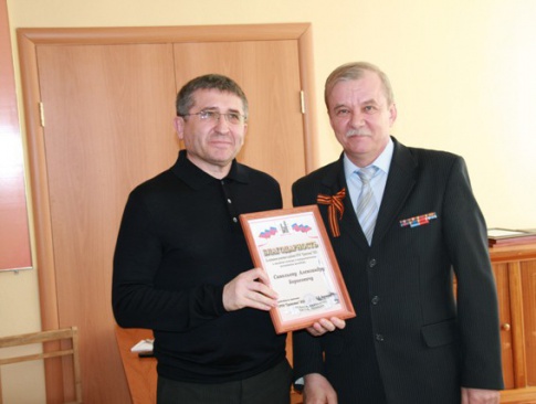 Вновь избранный председатель Совета "Братства", Василий Заровный, вручил Александру Савельеву благодарность за активное участие в деятельности "Братства" и за сотрудничество в патриотическом воспитании молодежи.