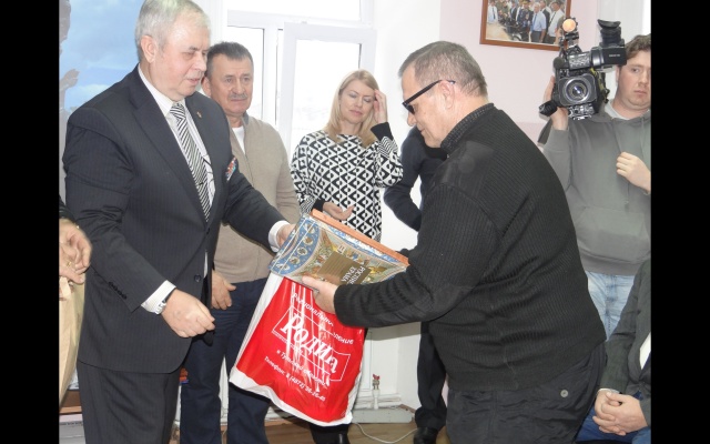 В дополнение к поздравительной речи Трифонов вручил 6 микроволновых печей, а также 25 продуктовых наборов.
